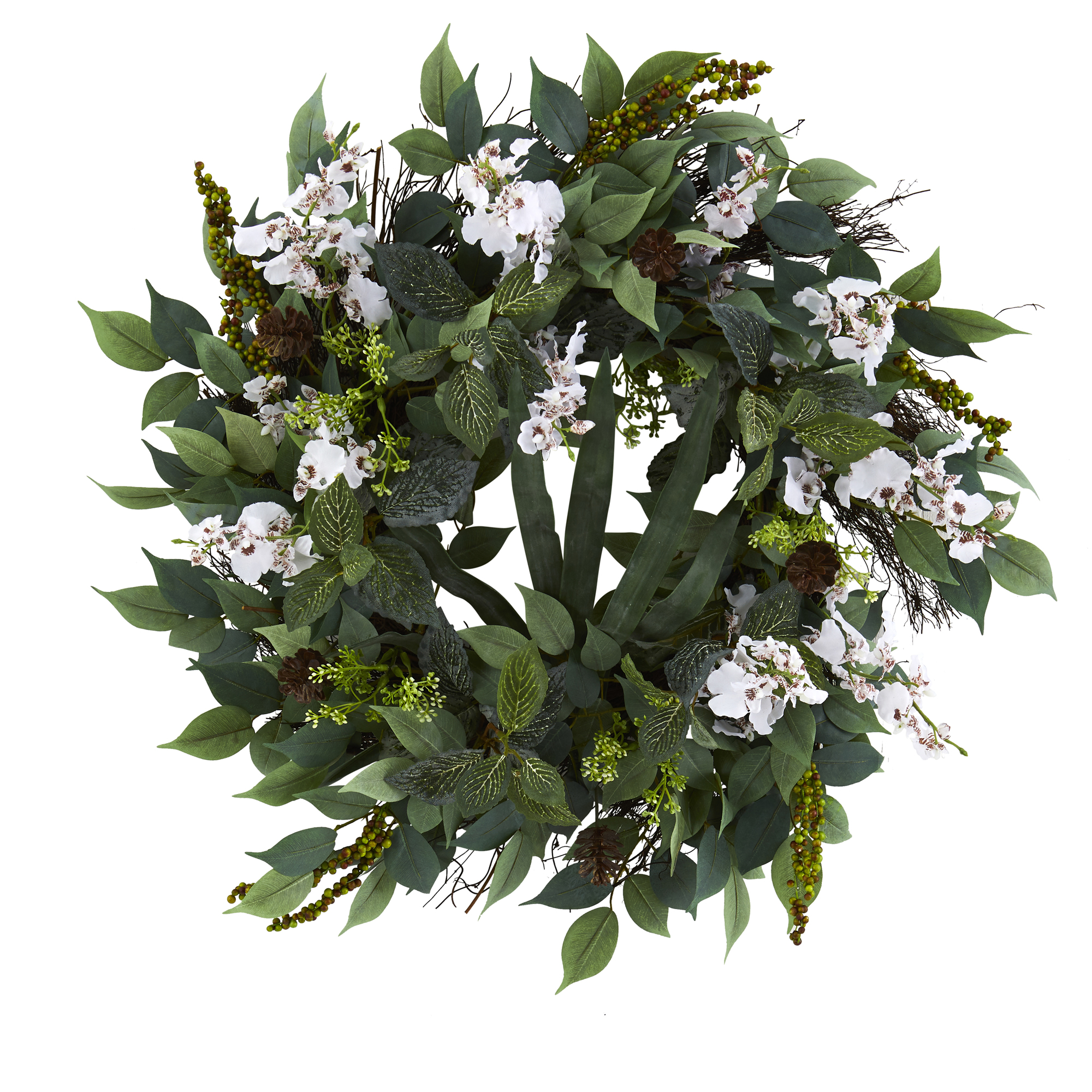 Update your traditional decor accents with the beauty provided by this artificial wreath intricately designed with mix greens and fittonia evergreens, delicately complemented with silk dancing lady orchids in soft, fresh hues and sprinkled throughout with realistic looking berries. Great for year-round display, this artificial wreath makes for an inviting accent and will undoubtedly transform your homeÆs front-door appeal.