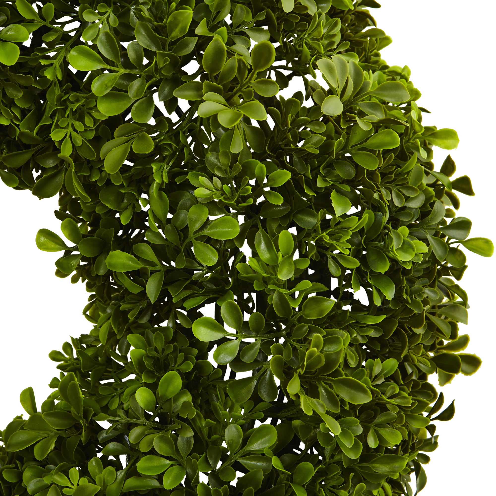 Bountiful boxwood bundles together for a lush, green wreath arrangement. Intricately placed and finely constructed, this boxwood wreath is perfect to use year round. Customize with black and white ribbon for a chic, farmhouse look, or place with glimmering candles for a holiday display.