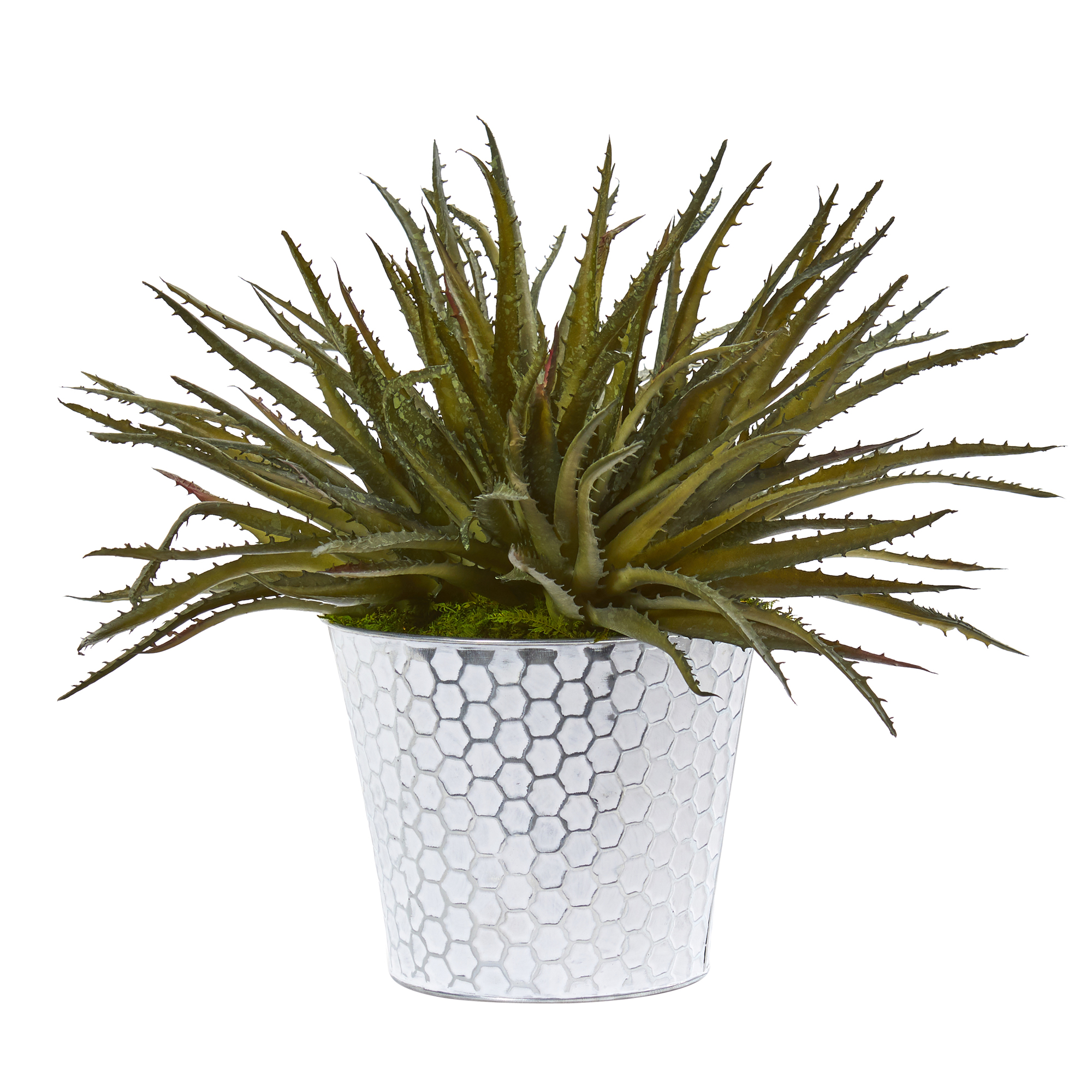 Bring unique textures to tight spaces with the help of this artificial aloe plant showcasing countless thick, lifelike silk leaves designed with naturally occurring details. Standing 13ö high from a white and tin planter nestled with natural moss, this lifelike ornament would easily complement most decor schemes.