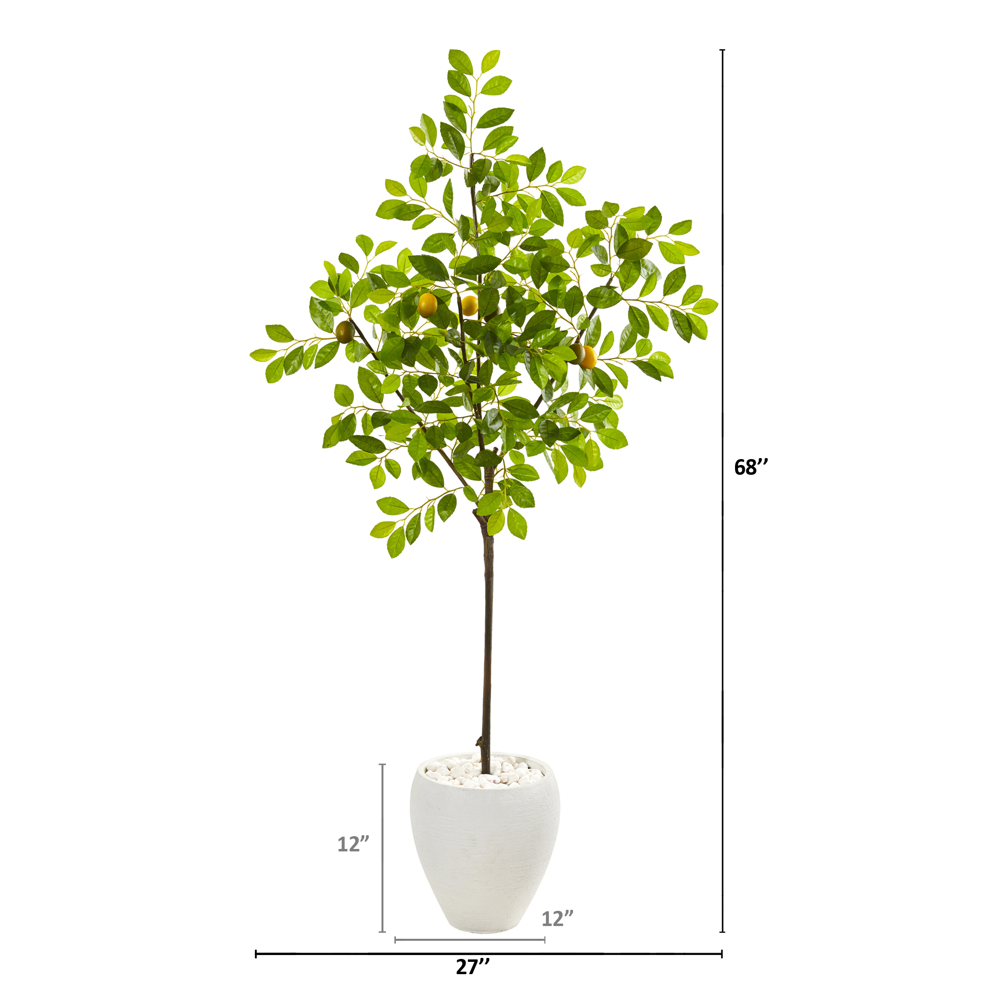 Easily freshen up bare spaces in your home with this artificial lemon tree boasting a realistic collection of brightly colored leaves highlighted throughout with intricately designed lemons. Standing 68ö high from a white planter, this silk tree hints of the countryside wherever displayed.
