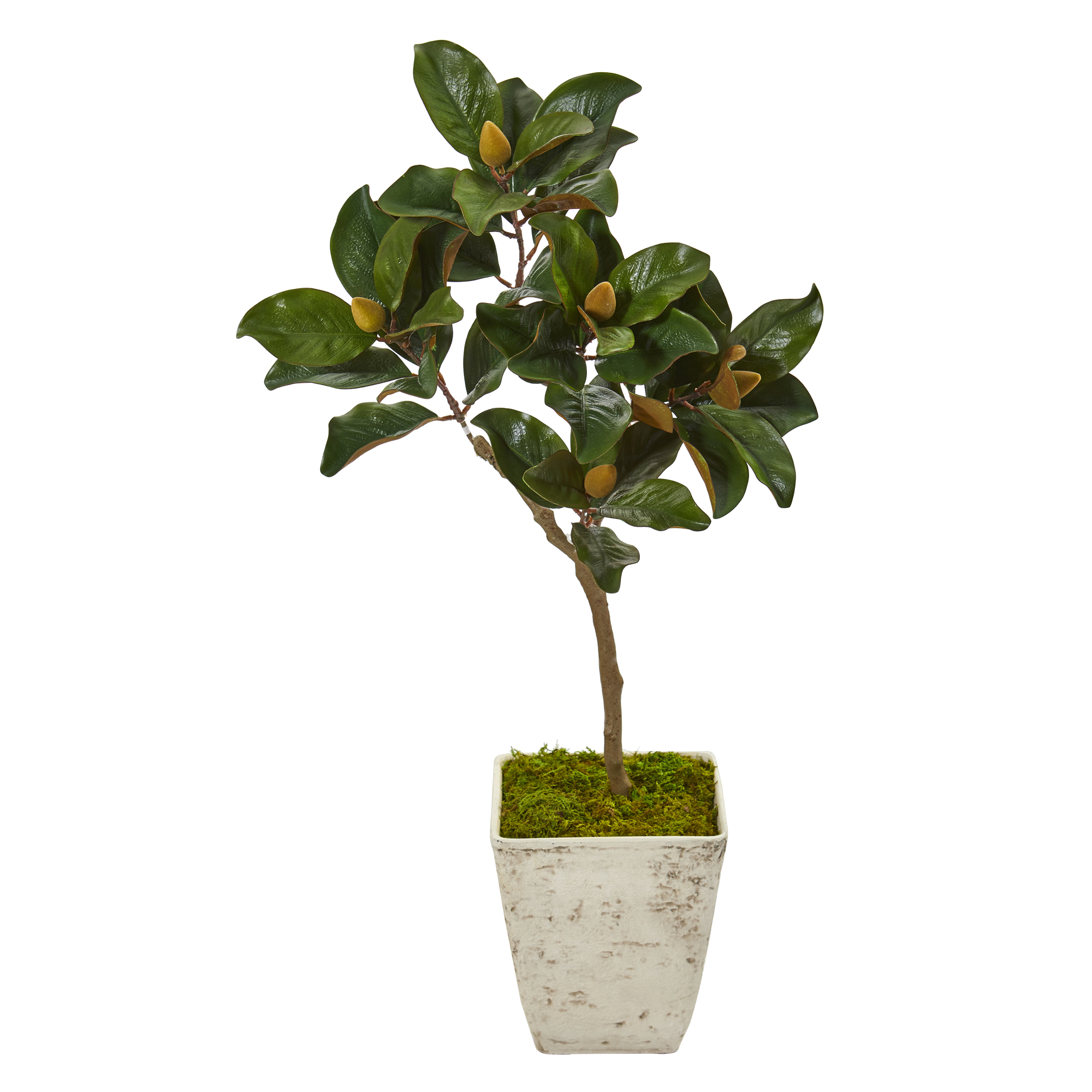Add lifelike greenery to accent everyday spaces with this artificial magnolia leaf tree featuring a thick collection of glossy, detailed leaves in bright hues and accented throughout with realistic looking buds. Standing 42ö high from a country-inspired white planter, this silk tree is great for either home or office display.